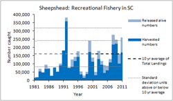 - No commercial fishery exists for sheepshead in South Carolina; however, significant recreational harvest is possible since fish associate with hard structure in close proximity to shore.