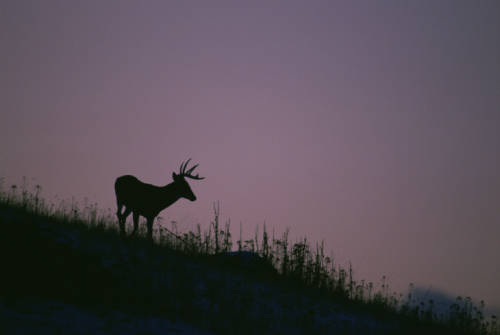 The silhouette of a White-tailed Deer standing on a hillside stands out against a purple sky at dusk. (USFWS)