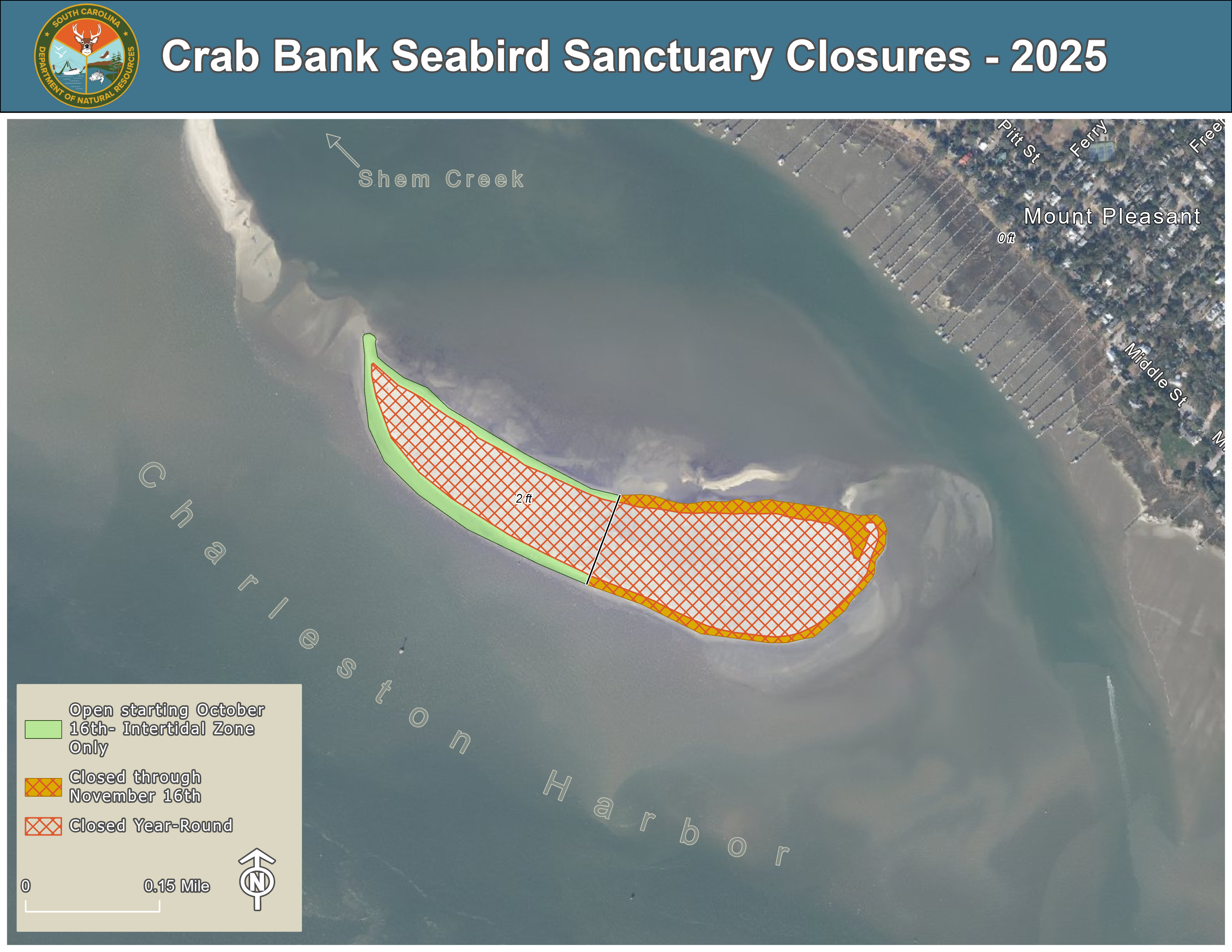 To protect these vulnerable chicks, SCDNR will extend the closure of the eastern end of Crab Bank beyond the standard reopening date of October 15. Beginning October 16, the western end of the island (intertidal zone only) will reopen for public access, while the eastern end will remain closed through November 15th. Closure boundaries will be marked with signs and buoys, visible at any tide.