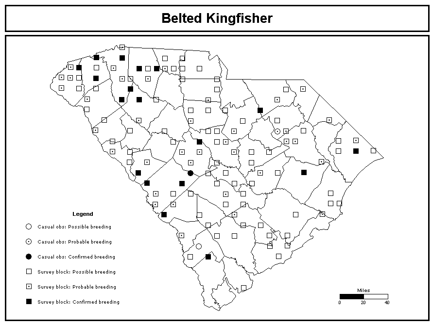 Because of restricted coverage, the South Carolina BBA did not effectively survey the breeding distribution of certain species such as Bald Eagles, Red-cockaded Woodpeckers, and other endangered and threatened birds, nor colonial-nesting wading birds or shorebirds. For information on the breeding status and ranges of the latter two groups, see Dodd, M.G., and T.M. Murphy. 1997. The status and distribution of wading birds in South Carolina, 1988-1996. Chat 61(3): 129-181 and Wilkinson, P.M. 1997. Survey and census of colonial nesting seabirds in South Carolina. Chat 61(4): 233-259.